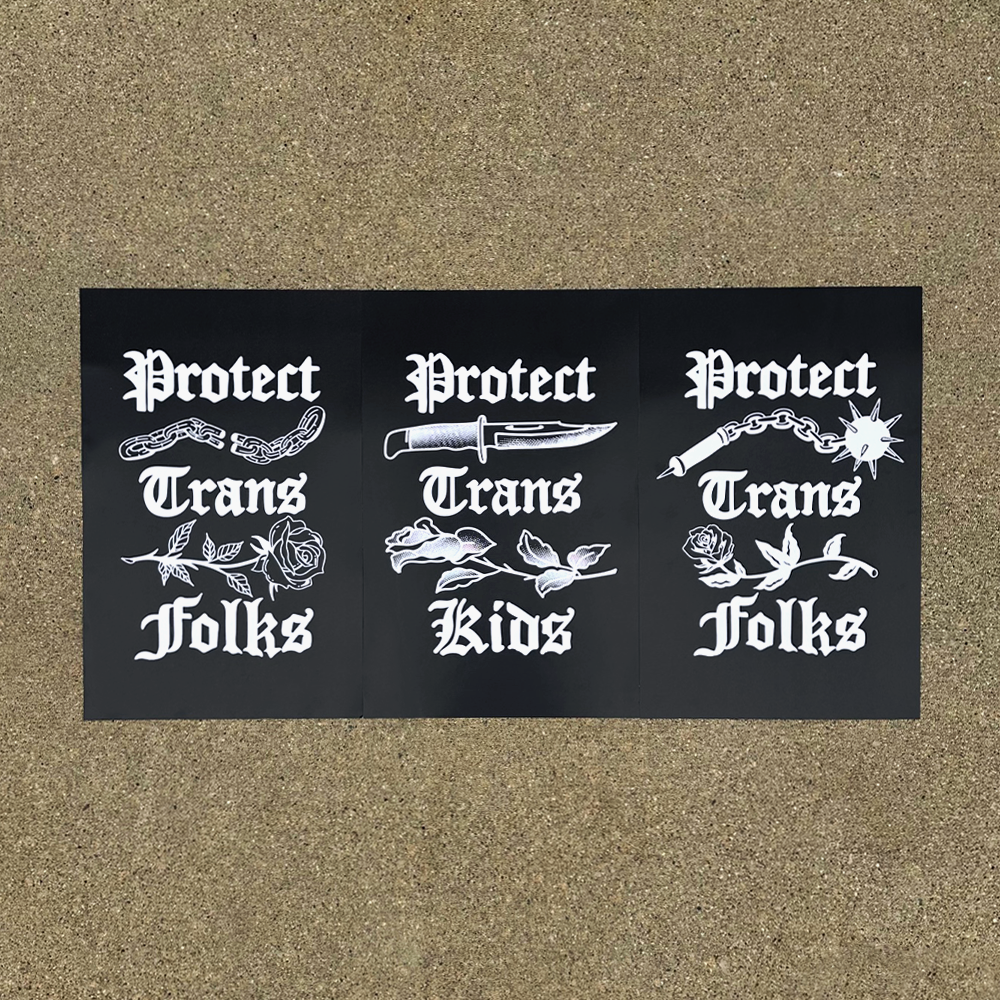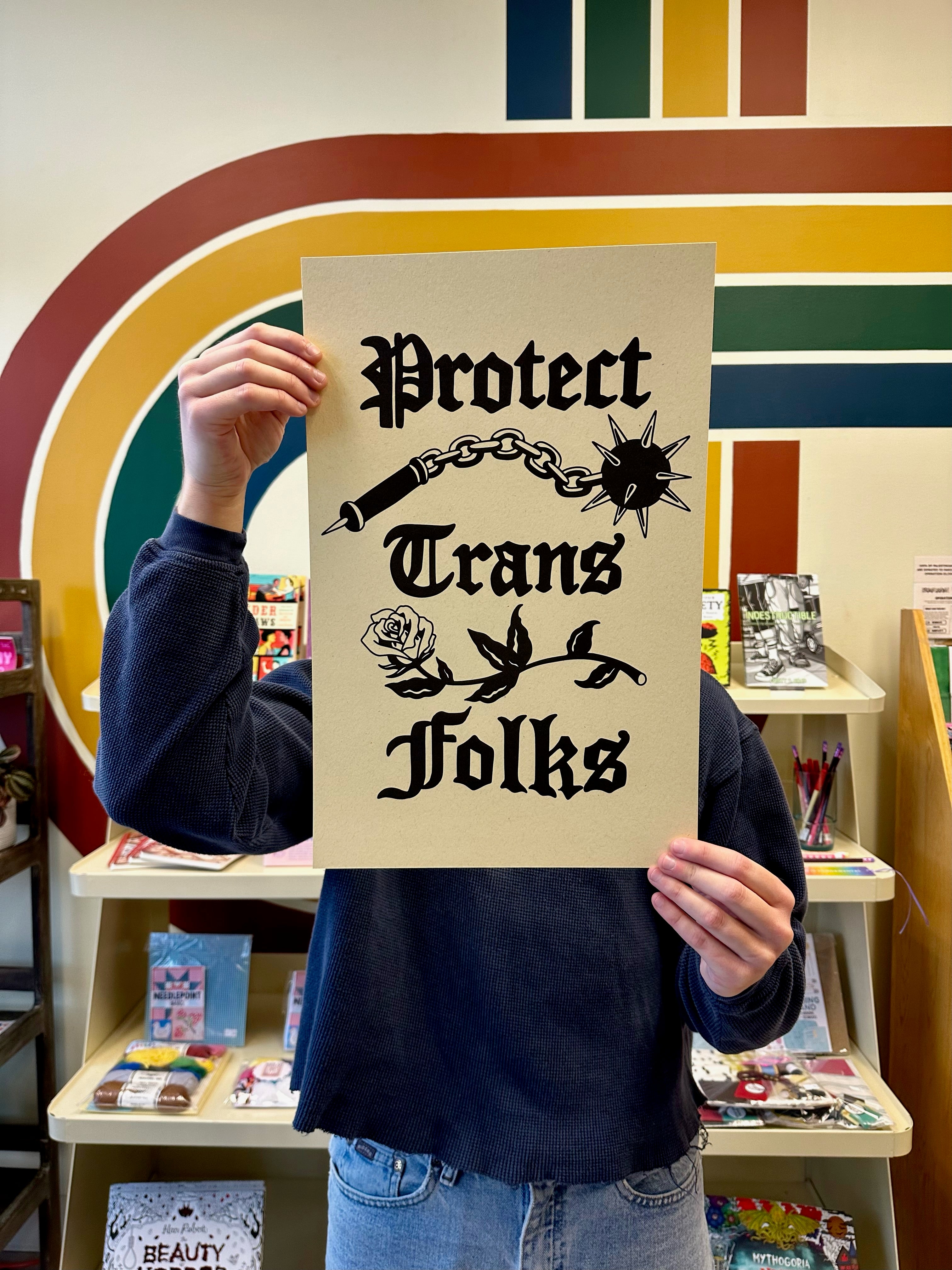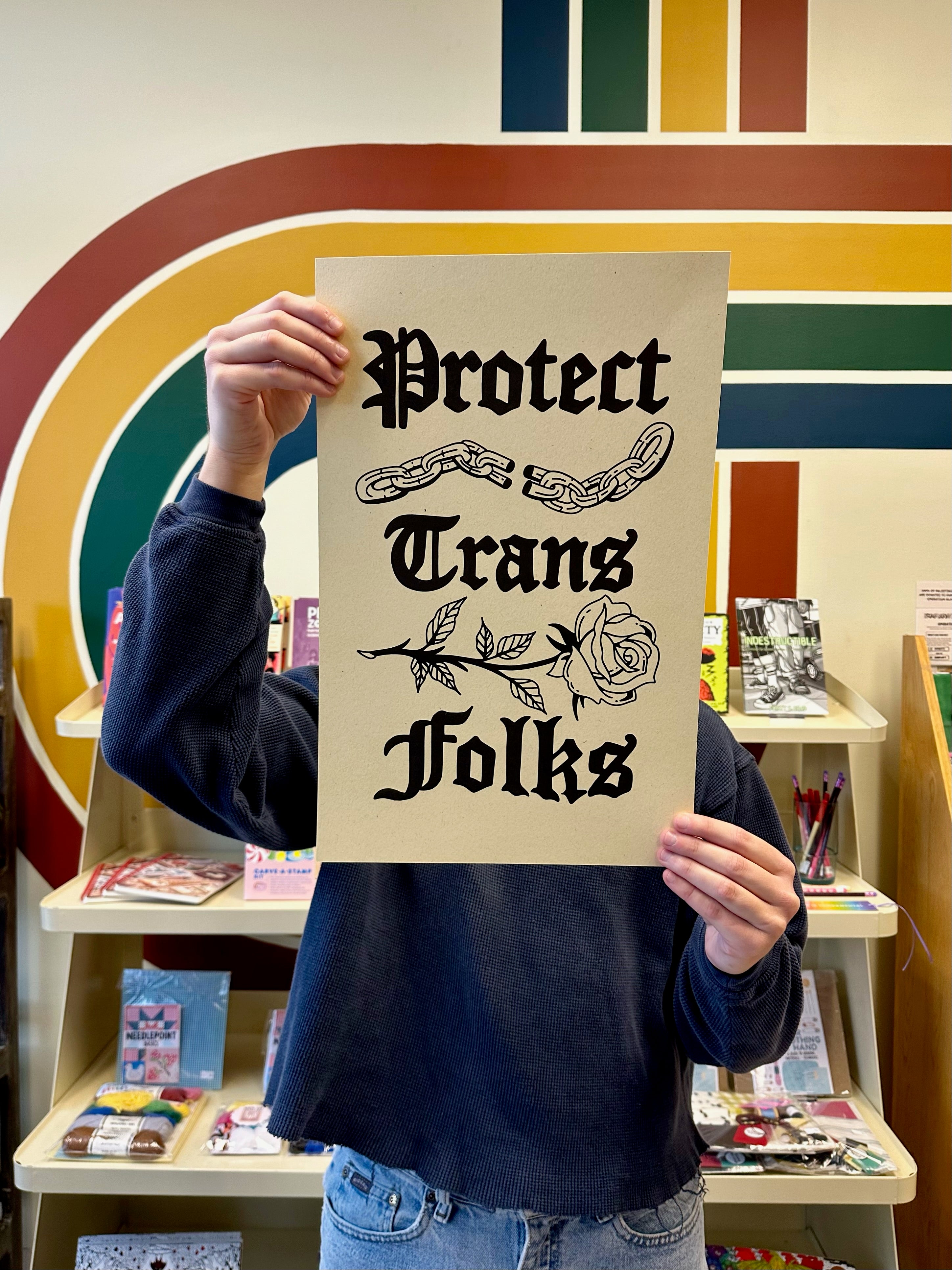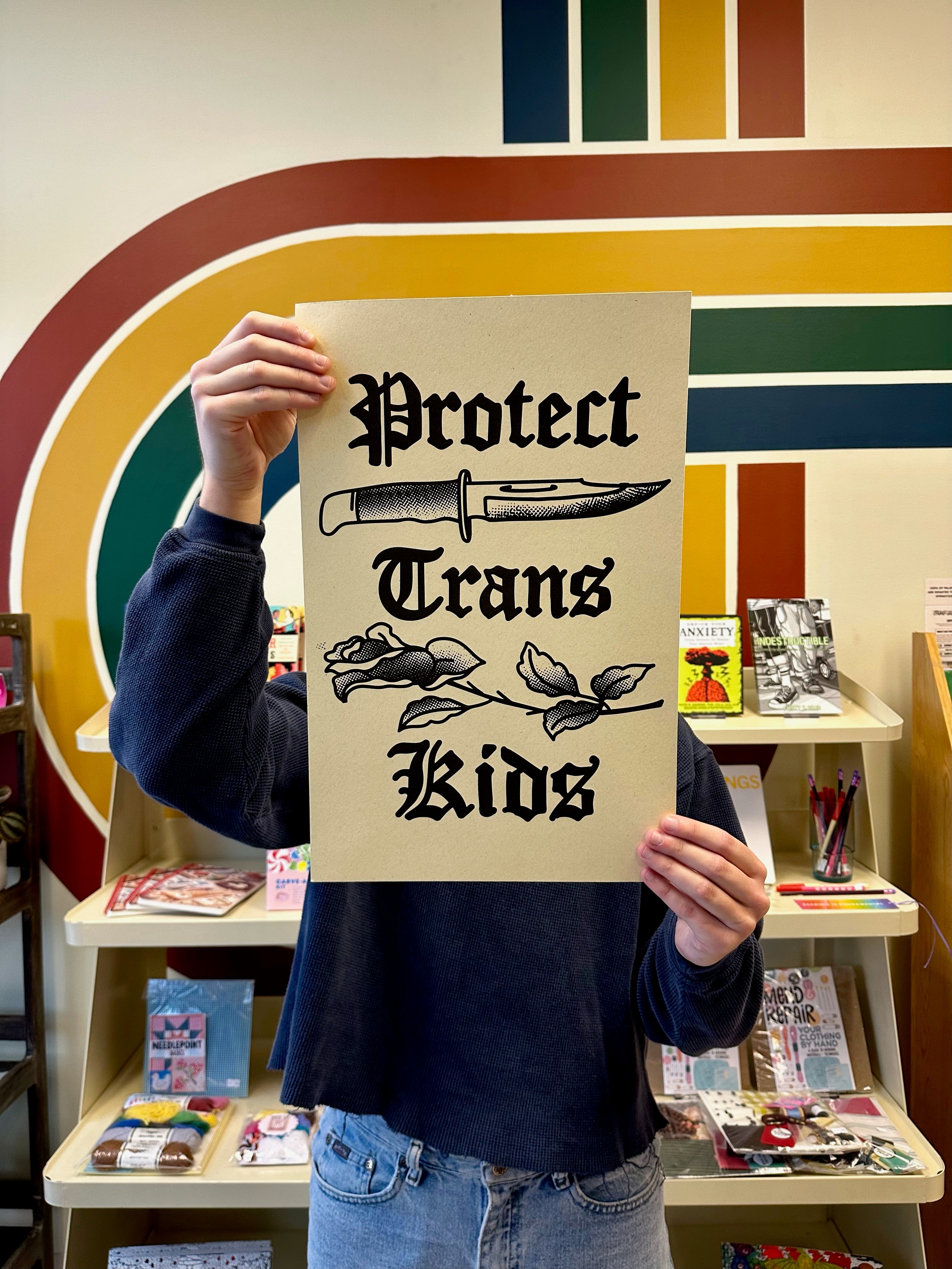 We carry a variety of goods designed by our in-house team and Queer artists from across the U.S. Maybe you’ve seen our viral “Protect Trans Kids” shirt designed by Rio Wolf floating around the internet? Go ahead and get your own!