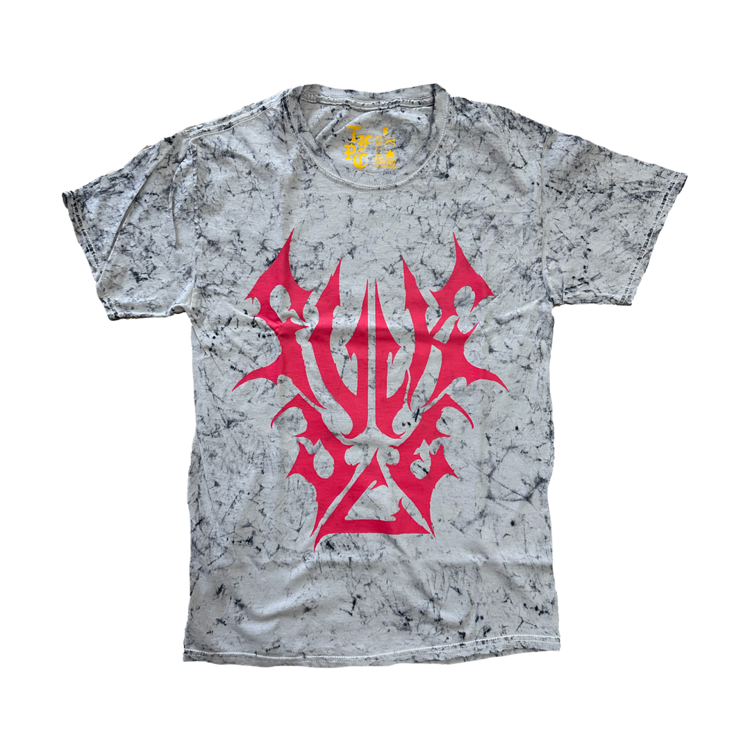 Image description: A white and grey tie dye short sleeve shirt. The design is printed large on the front in a bright red ink. The design reads "fuck ice" in a metal inspired insignia.