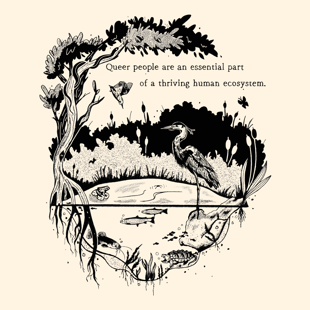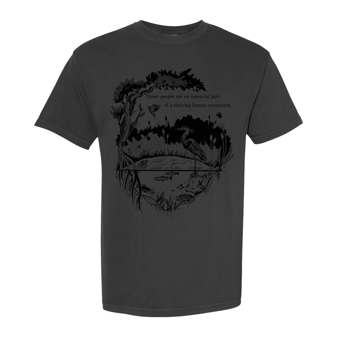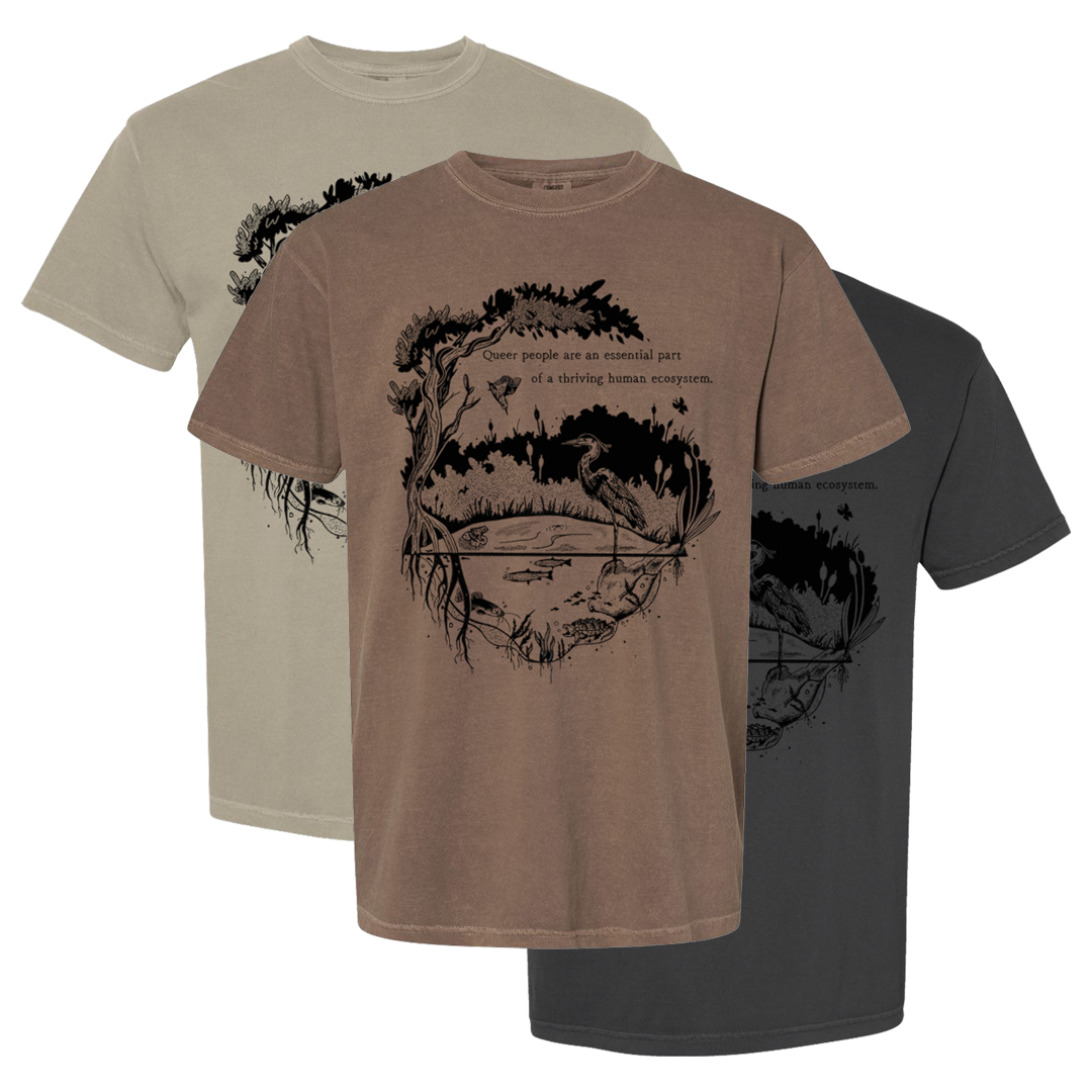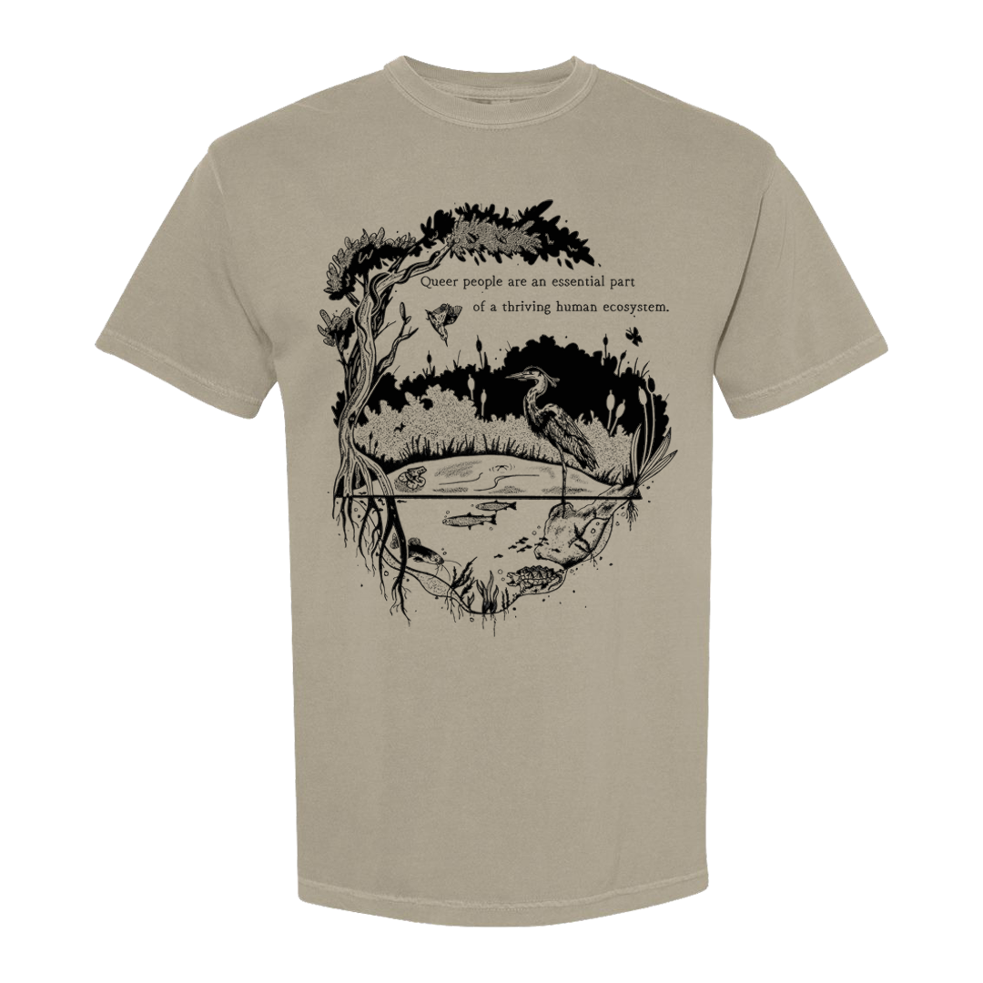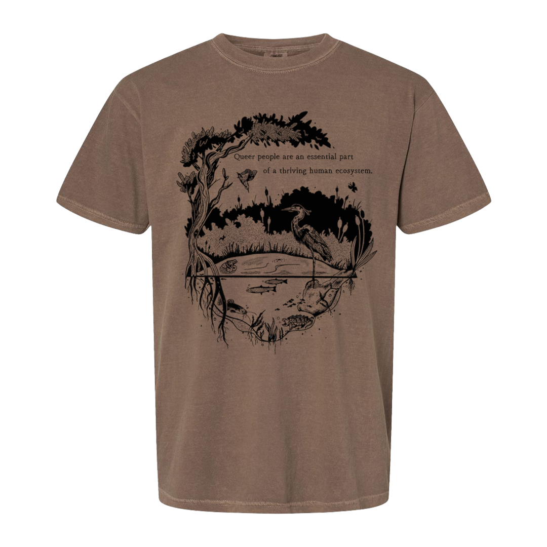 Image description: A sand, light brown, or dark grey short sleeve shirt with a design in black ink. The design reads "Queer people are an essential part of a thriving human ecosystem." There is a body of water with multiple different species of wildlife, fish, turtles, bird, and a crane, among others. There is a large tree wrapping around the design with cat tails in the background of the body of water.