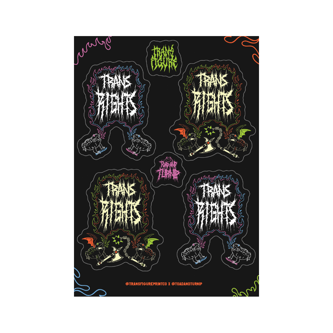 Image Description: A matte black rectangular sticker sheet with pink, orange, blue, and green flames in the four corners. Inside are four designs, two of each design. Both designs are two toads breathing flames with the words "Trans Rights" inside them in a metal font. One design has the two toads holding knives. The other design has the two toads with wings, holding a big axe, and the other a flail. One design is in blue, pink, and white. The other in orange green, and white. There are two logos on the sheet, one says Transfigure, the other says toad and turnip, both in a metal font. The text on the bottoms says @transfigureprintco x @toadandturnip.
