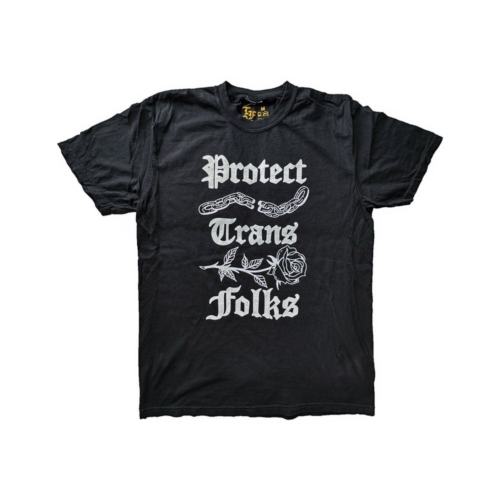 Image description: A black short sleeve shirt with the statement “Protect Trans Folks” with a rose and chain between the letters, all in a white gothic font.
