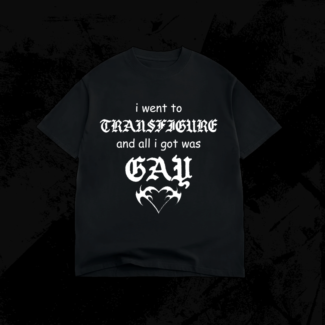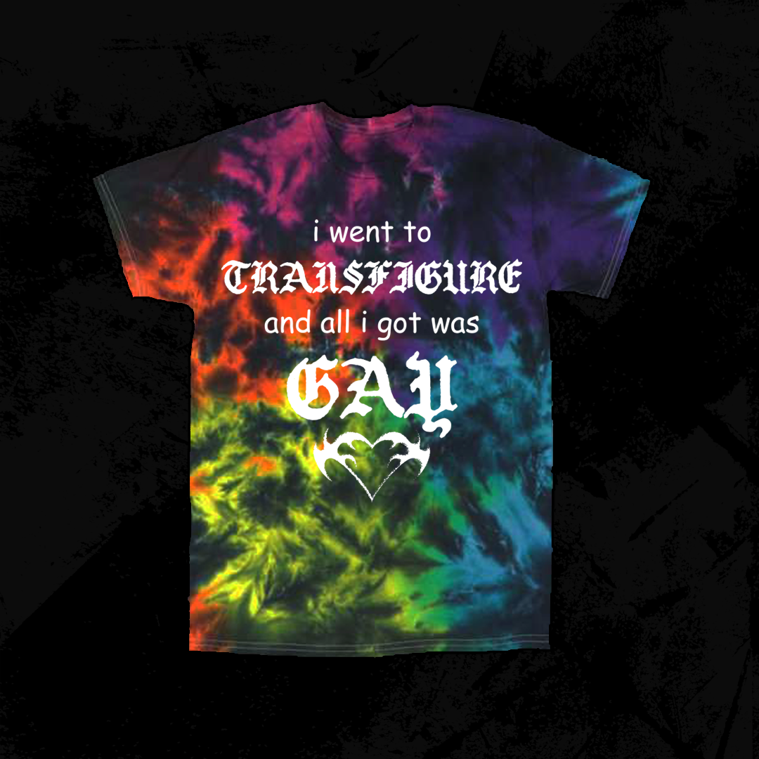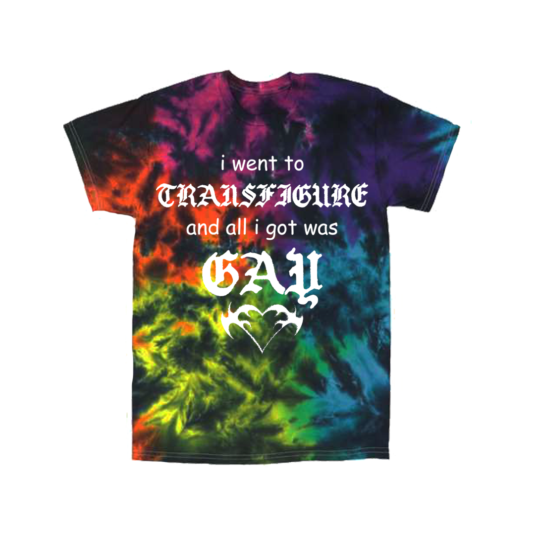 Image Description: A black or purple, pink, blue, green, yellow, and orange tie dye with the design in white. The design says "i went to TRANSFIGURE and all i got was GAY" stacked on top of each other. At the bottom is a stylized heart shape.