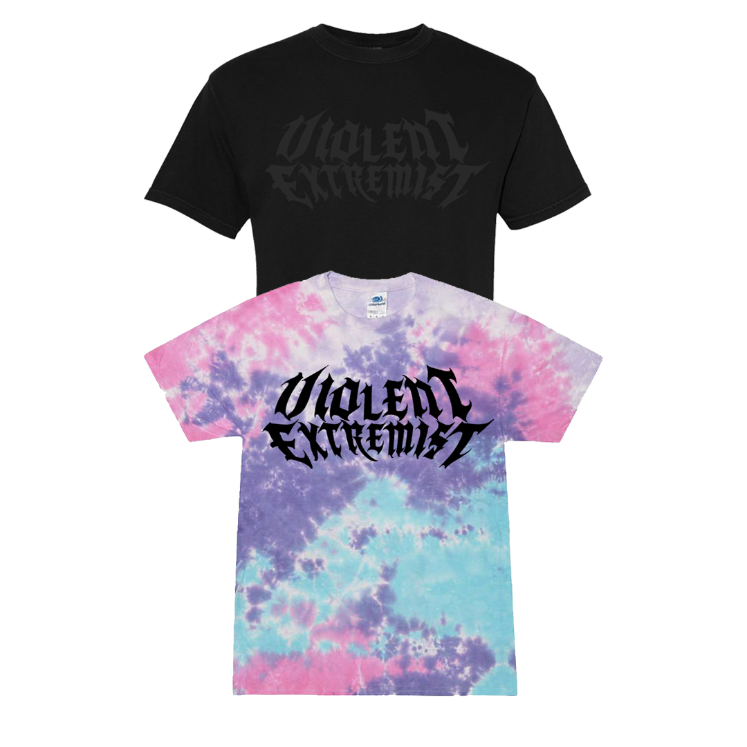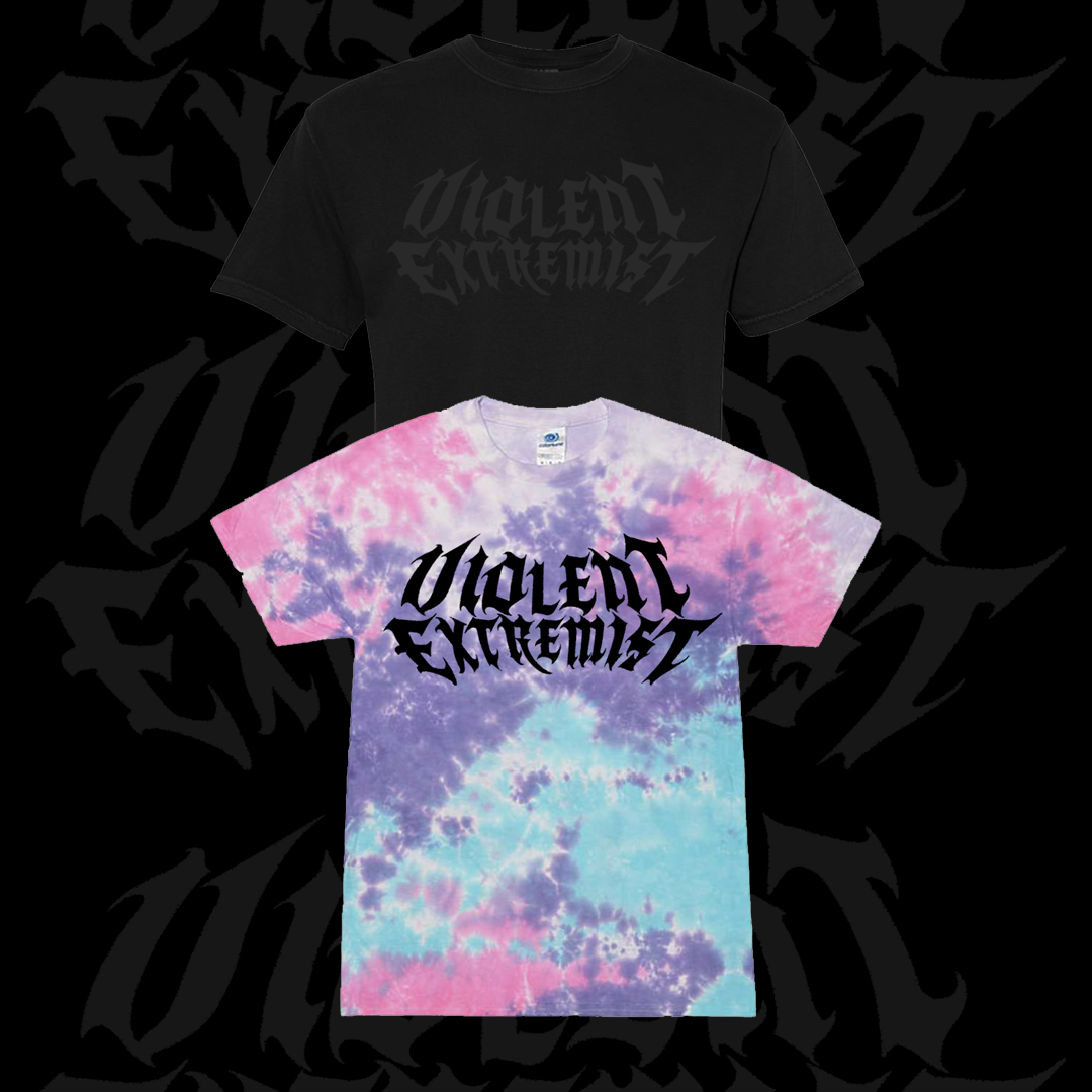 Image description: A black short sleeve shirt with dark grey metal themed text that reads "Violent Extremist" in the center. The second option is a pink, purple, blue, and white tie dye shirt with black metal themed text that reads "Violent Extremist" in the center.