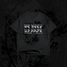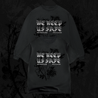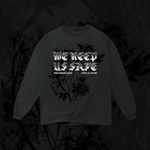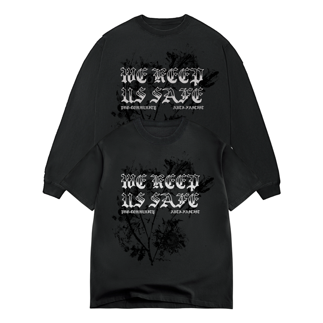 Image description: A dark grey long sleeve or short sleeve shirt. Across the chest it says "WE KEEP US SAFE" in a bold old english font in a white. Below that on the left it says "pro-community" and below on the right it says "anti-fascist". Underneath the text are textures of flowers/stems all in black ink.