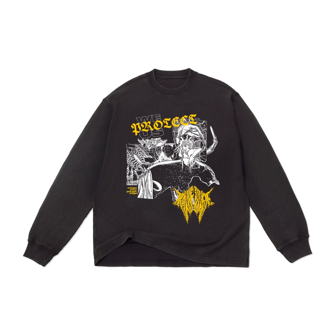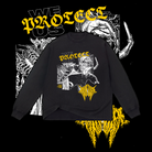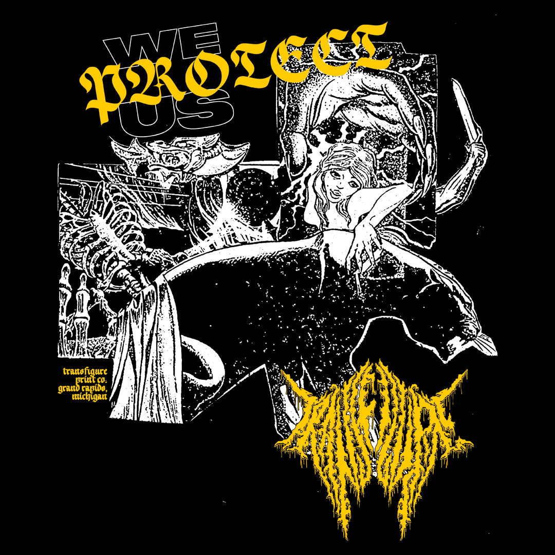 Image description: A black long sleeve shirt with the design in white ink and yellow ink. The image has text in the top left that reads "WE PROTECT US" in thick white and yellow lettering. The bottom lower left has smaller text that reads "transfigure print co. grand rapids, michigan" in yellow. The bottom right has a metal band inspired insignia in yellowthat reads "Trans Figure". Inside all of the text are collaged images such as a panther, skeletons, a long haired figured, an arm holding a sword, and overlapping textures. All of the imagery is in white.