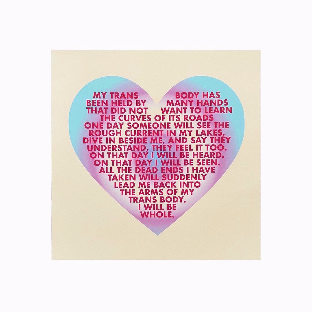 Image Description: A 10" by 10" digital print on off white/cream paper with a heart in the middle that is trans flag colors (pink, white, and blue). It has red text within the heart that says "My trans body has been held by many hands that did not want to learn the curves of its roads one day someone will see the rough current in my lakes, dive in beside me, and say they understand, they feel it too. On that day I will be heard. On that day I will be seen. All the dead ends I have taken will suddenly lead me back into the arms of my trans body. I will be whole."