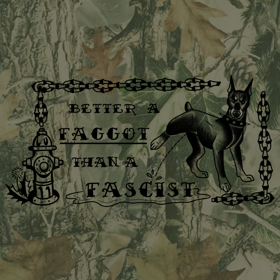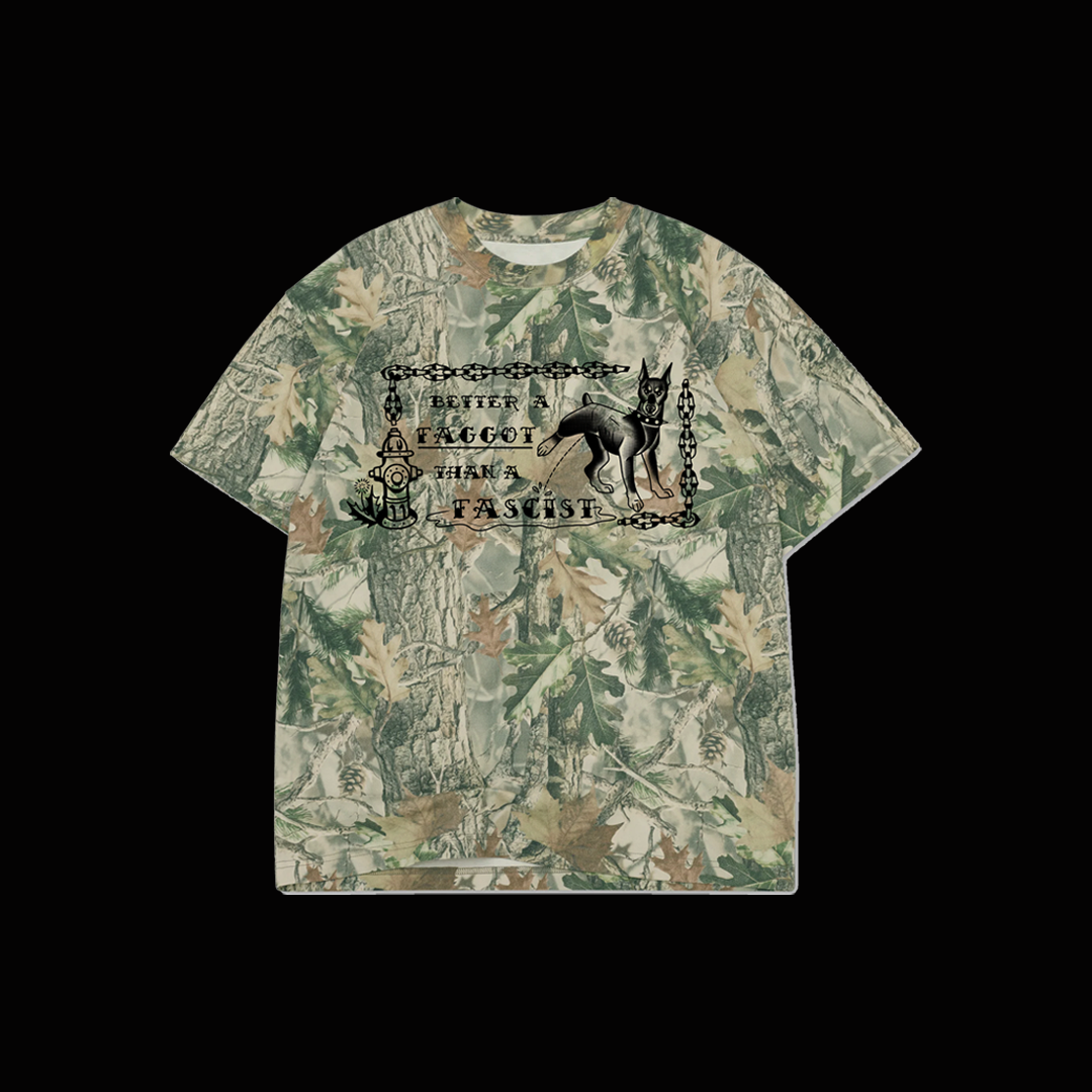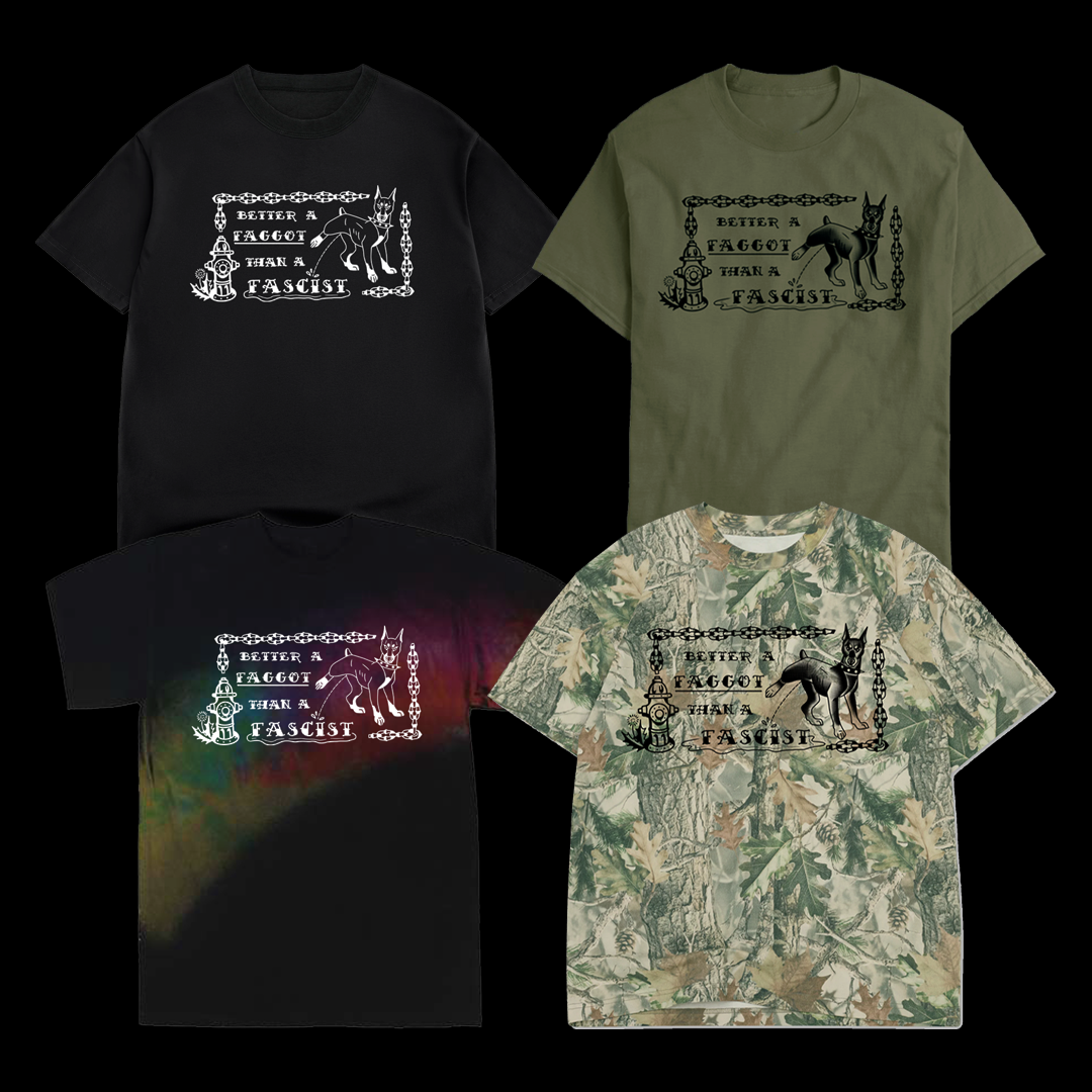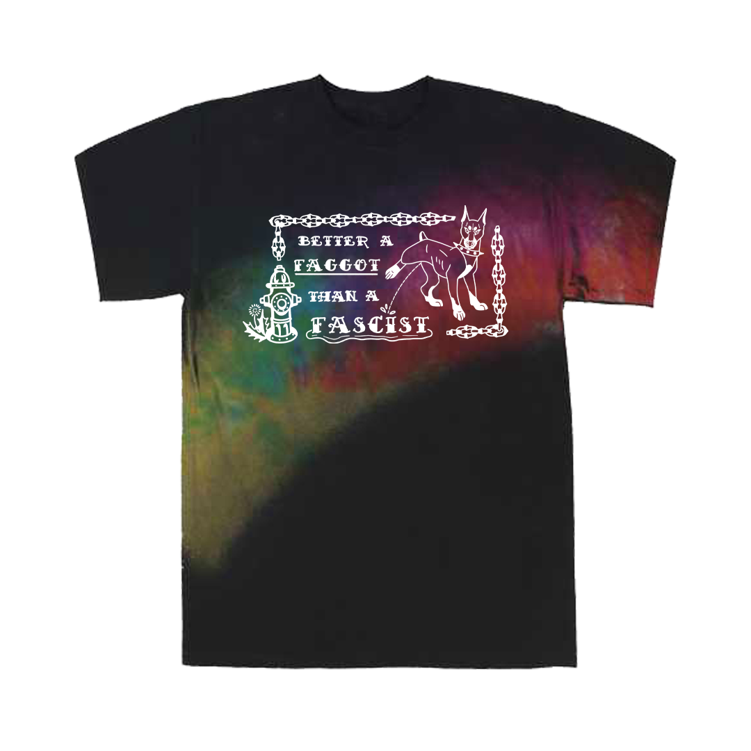 Image description: A dark green or camo short sleeve shirt with the design in black ink. Or a black or black and tie dyed (yellow, green, purple, red, and pink) shirt with the design in white. The design reads "Better a Faggot Than a Fascist" The text is a traditional tattoo font and the entire design is bordered with chain links. To the right of the text is a doberman with its leg up peeing on the word Fascist with a puddle underneath. To the left of the text is a fire hydrant.