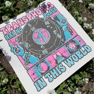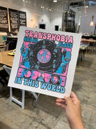 Image Description: A 10” x 10” black, pink, and blue, print on white cardstock. The design reads “Transphobia has no place in this world” and has two hands with broken chains attached, between the hands is a globe with five skeletons dancing around it holding hands. Other design elements floating around the skeletons include tiny worlds and stars as well as a sun and moon.